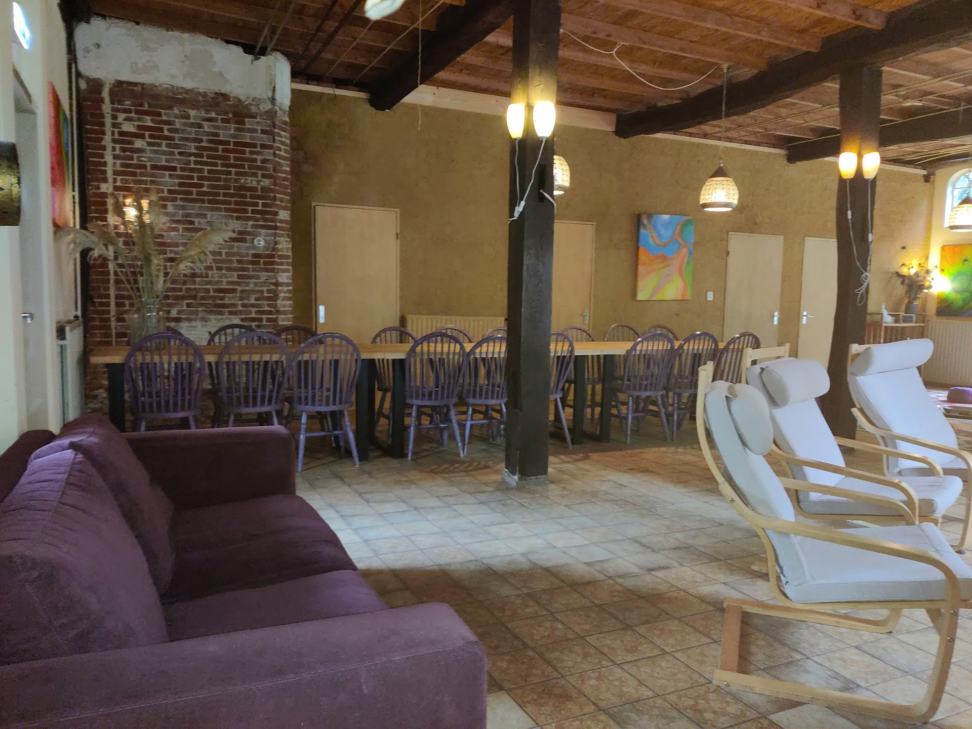 De zithoek in de woonkamer en de kampvuurkuil in de tuin nodigen uit om samen rond een vuurtje te zitten, je met elkaar te verbinden en je energie weer op te laden. Het eetgedeelte biedt voldoende plaats om gezellig met de hele groep aan één lange tafel te kunnen eten.